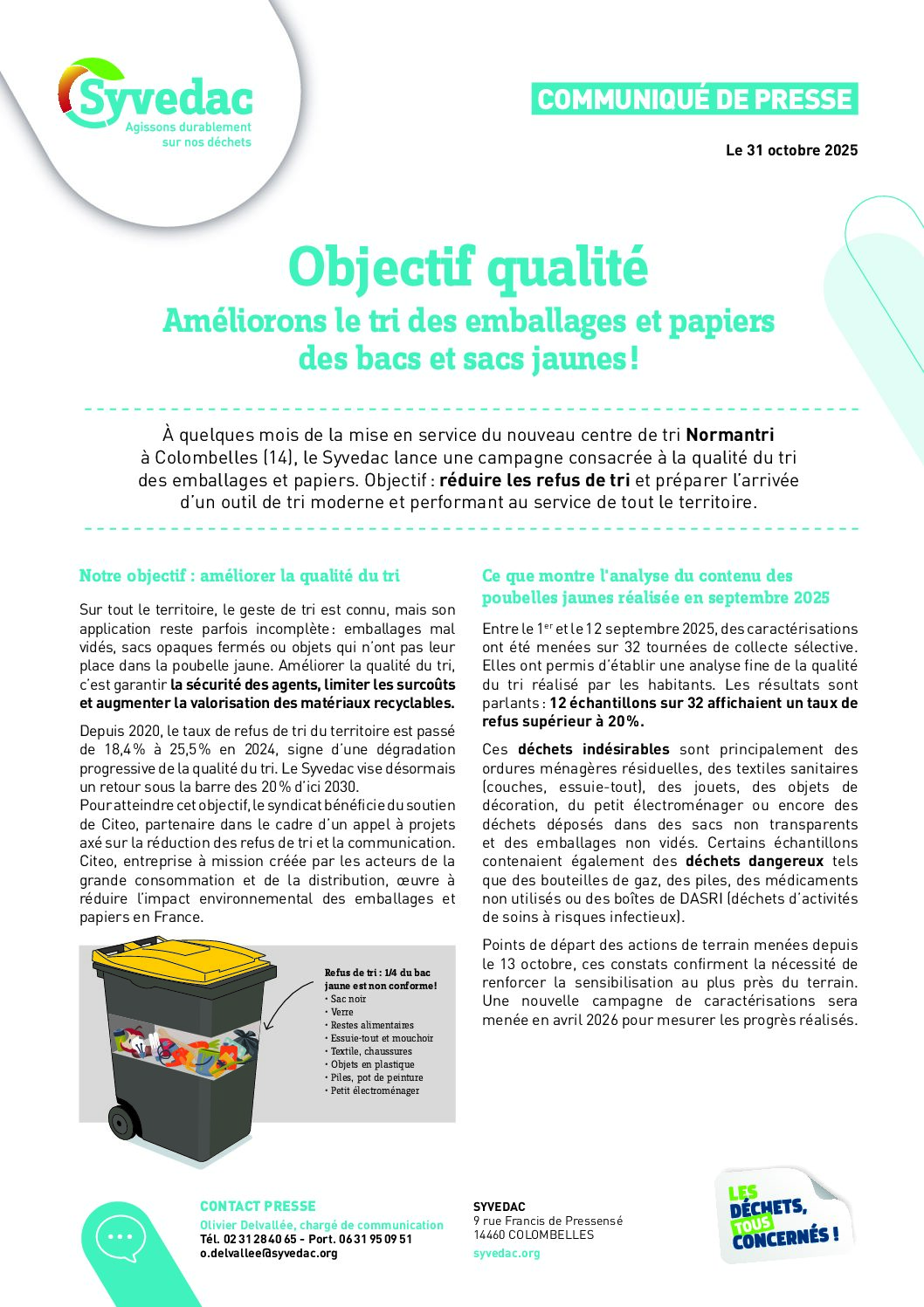 Objectif qualité : améliorons le tri des emballages et papiers, des bacs et sacs jaunes.